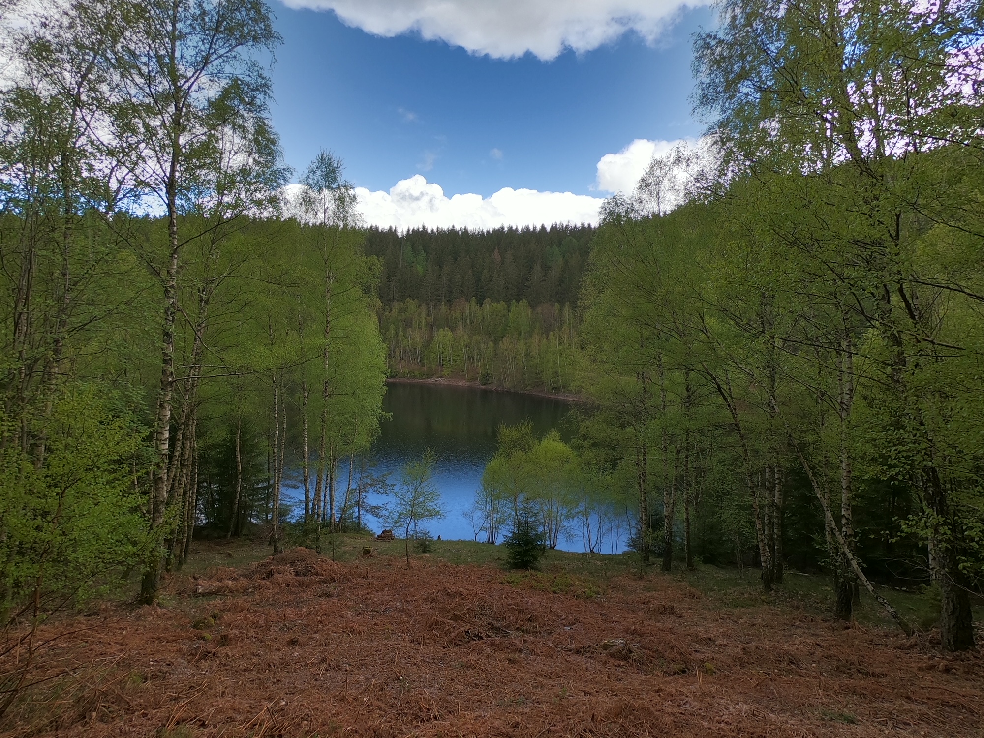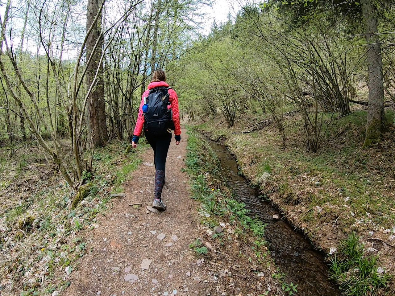Entlang des Altbachs gelangten wir danach schon bald zur Talsperre Nonnweiler. Der Stausee umfasst eine Oberfläche von ca. einem Quadratkilometer und ist damit das größte Trinkwasserreservoir in Rheinland-Pfalz sowie im Saarland. Wassersportliche Aktivitäten wie Schwimmen oder Bootfahren sind hier entsprechend untersagt, was uns eine herrliche Ruhe beim Wandern entlang des Wassers bescherte. Da das Wetter sehr wechselhaft war, sind uns ohnehin nur wenige Menschen auf der Tour begegnet. Etwa zwei Kilometer blieben wir auf diesem Weg.